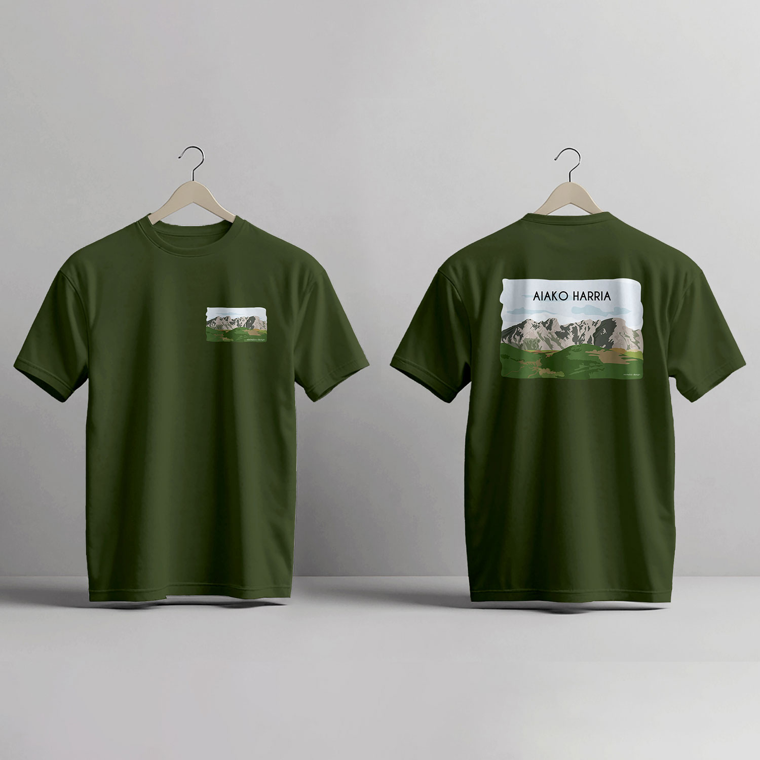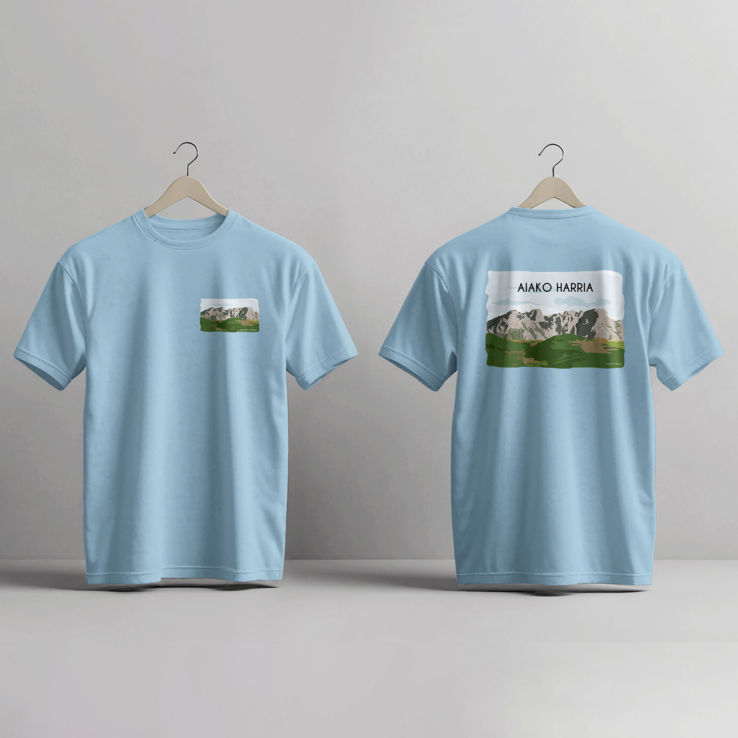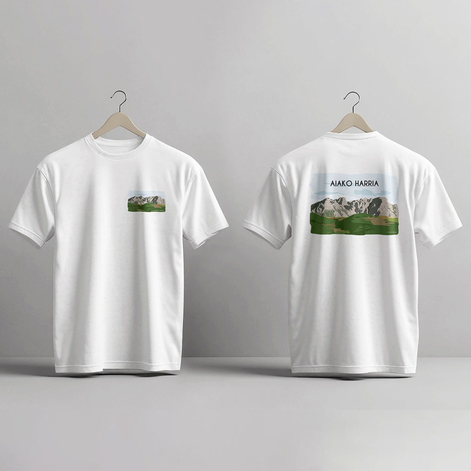 Camiseta unisex con ilustración digital de Aiako Harria. Disponible en varios colores y tallas. Diseño exclusivo para amantes de la naturaleza y el paisaje vasco. Ilustración disponible en lámina impresa a color en tamaño A4, postal, imán, marcapáginas, camiseta y tote bag. Envío incluido